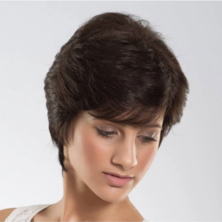 - Rövid, egyenes fazonú paróka előre befésült frufruval és oldalt arcba fésülhető tincsekkel